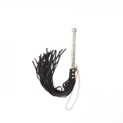 Fouet mince en suède avec poignée métallique et chaîne amovible.